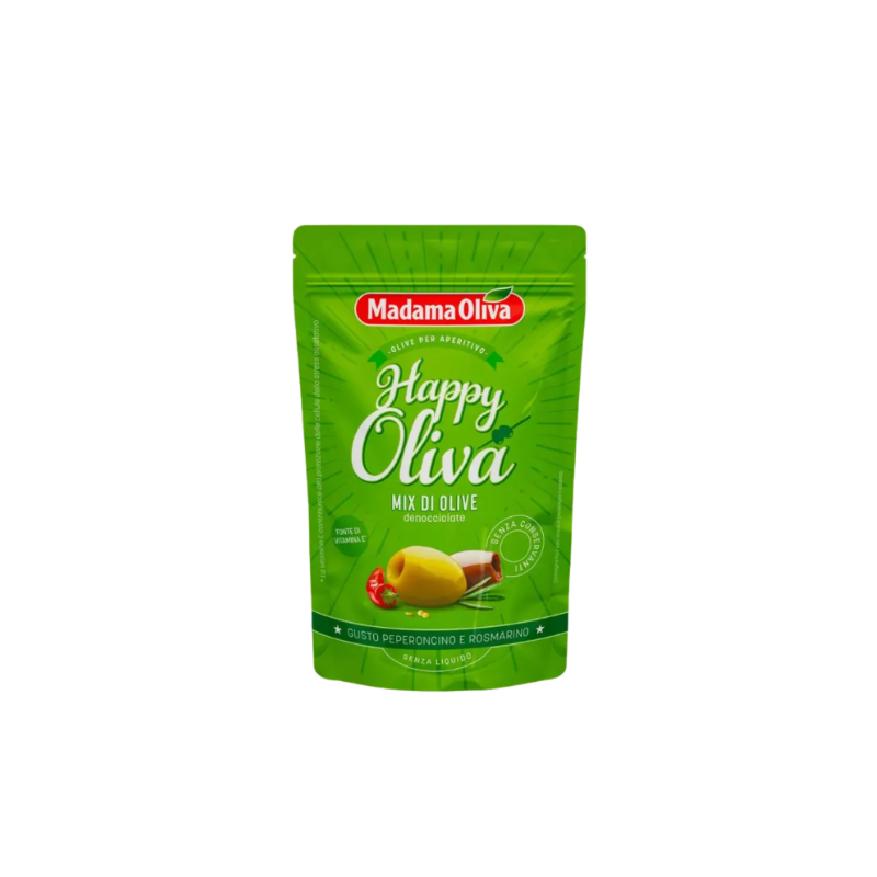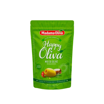 PITTED OLIVE MIX WITH CHILLY PEPPER & ROSEMARY (80G) - MADAMA OLIVA